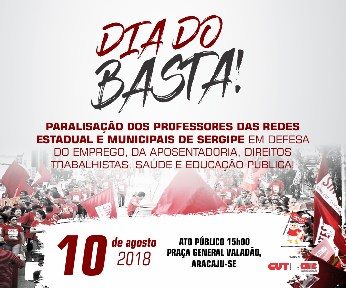 Diante dos sucessivos golpes sofridos contra educação, ao longo de dois anos do governo ilegítimo de Michel Temer, professores e professoras da rede estadual e das redes municipais de Sergipe paralisam suas atividades, no dia 10 de agosto e aderem ao ‘Dia do Basta’, convocado pela Central Única dos Trabalhadores (CUT), em todo o Brasil.