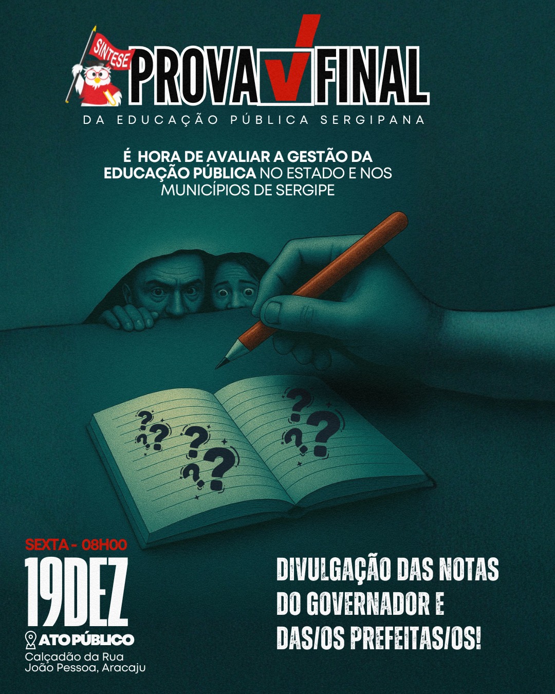 O tradicional ato do SINTESE, “Prova Final”, acontece nesta sexta-feira, dia 19, no Calçadão da João Pessoa, em frente à Caixa Econômica, no Centro da capital. A nossa última mobilização de 2025, vai avaliar, a partir de notas, de zero a dez, a gestão da educação pública realizada pelos 74 prefeitos e prefeitas, dos municípios onde o SINTESE representa o conjunto das professoras e professores, e também a gestão feita pelo Governador do Estado.