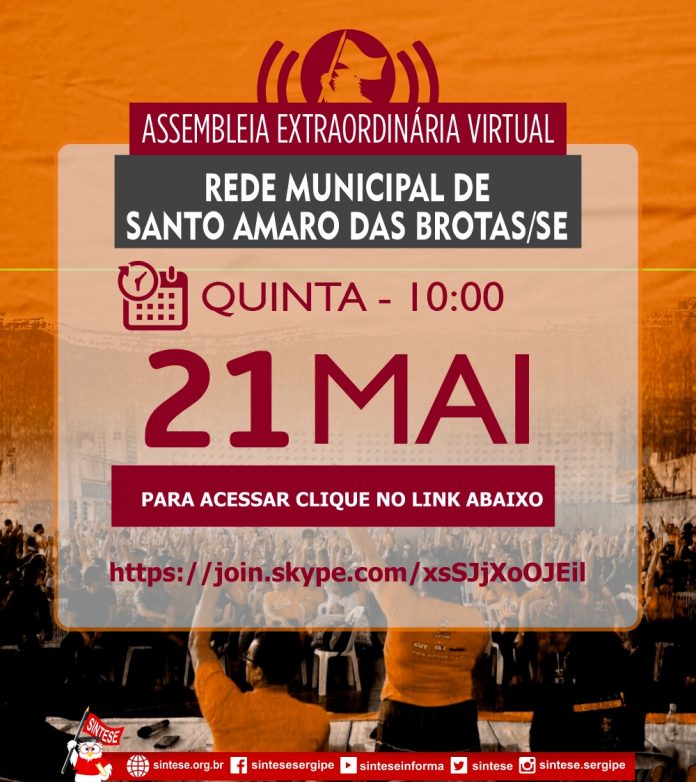 Pelo presente Edital, de acordo com o Estatuto do SINTESE e da Resolução CERES Nº 01/2020, que dispõe sobre a regulamentação da realização de Assembleia Geral Virtual, nos termos do Estatuto do SINTESE – Sindicato dos Trabalhadores em Educação Básica da Rede Oficial do Estado de Sergipe, fica convocado os Profissionais do Magistério da Rede Pública do Município de Santo Amaro das Brotas, em Sergipe, para participarem da Assembleia Geral Extraordinária Municipal Virtual, através do aplicativo SKYPE, cujo acesso deverá ser pelo link abaixo especificado: