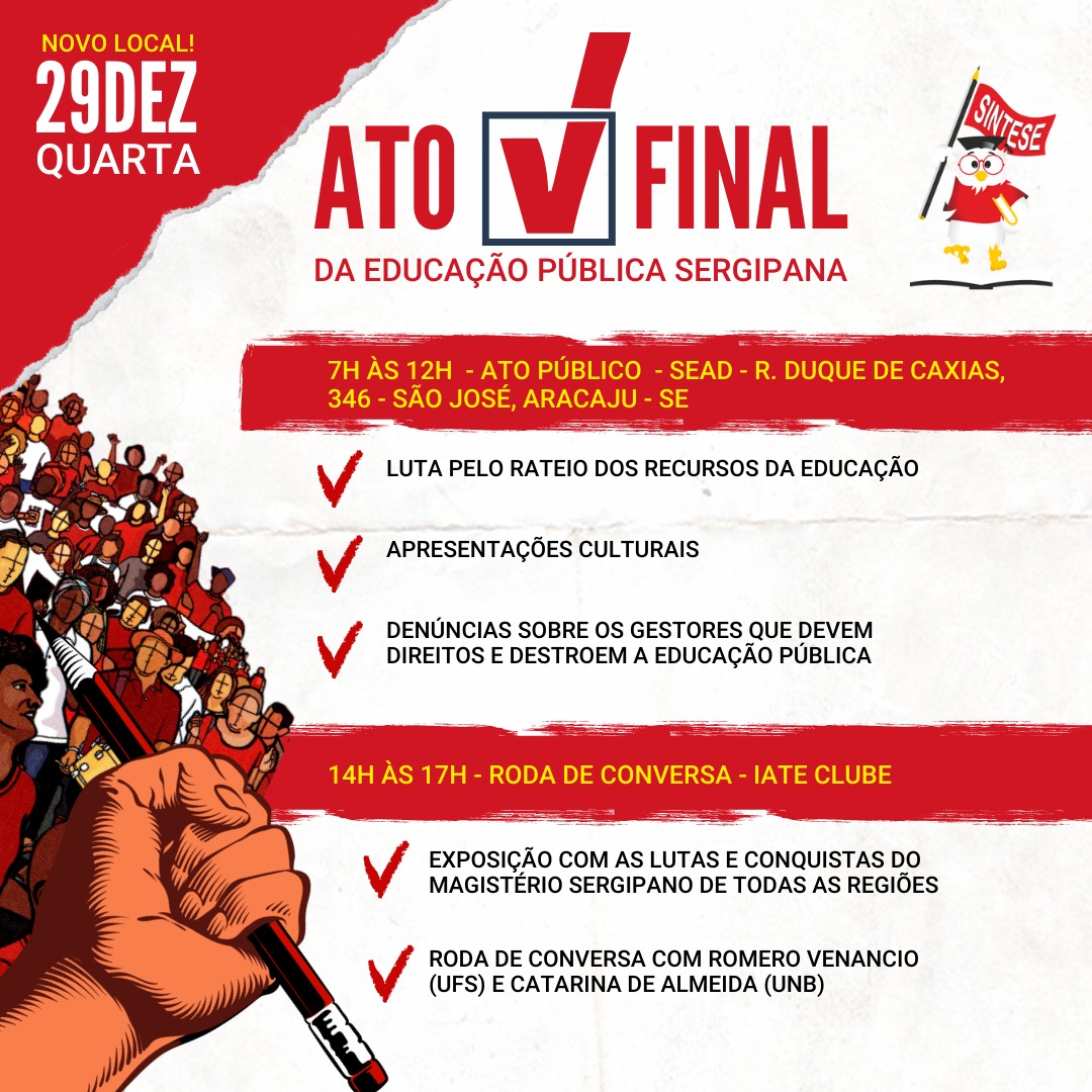Em assembleia realizada na tarde desta terça, dia 28, os professores e professoras da rede estadual definiram que o ato de final de ano que estava marcado para acontecer na praça General Valadão mudou para a Secretaria de Estado da Administração (antiga Seplag), localizada na rua Duque de Caxias, 346.