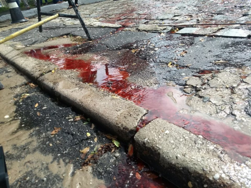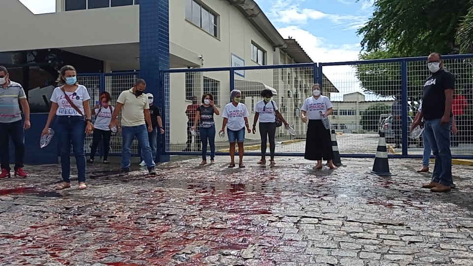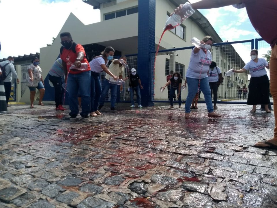 Professoras e professores derramaram na entrada da Seduc groselha diluída em água para simbolizar o sangue derramado de professores, estudantes, funcionários de escolas e seus respectivos familiares se as aulas presenciais retornarem nas escolas públicas.