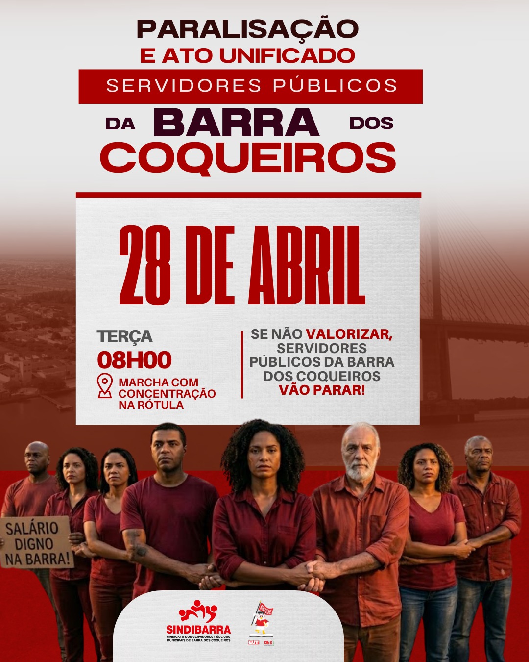 Dando seguimento à luta que vem sendo travada de forma unificada, na Barra dos Coqueiros, professoras, professores e um conjunto de categorias de servidores municipais vão paralisar suas atividades na terça-feira, dia 28 e farão uma passeata até a prefeitura da cidade para cobrar do gestor municipal, Airton Martins, diálogo, negociação e respeito a direitos e aos servidores. A concentração da passeata será às 8h, em frete à rótula.