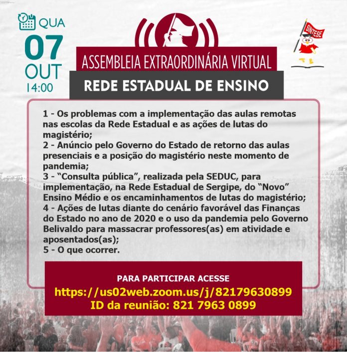 Na próxima quarta, dia 07, às 14h o SINTESE convoca assembleia extraordinária da rede estadual e considerando os cuidados com a saúde e segurança em tempos de Covid-19 a assembleia será realizada online através do aplicativo Zoom.