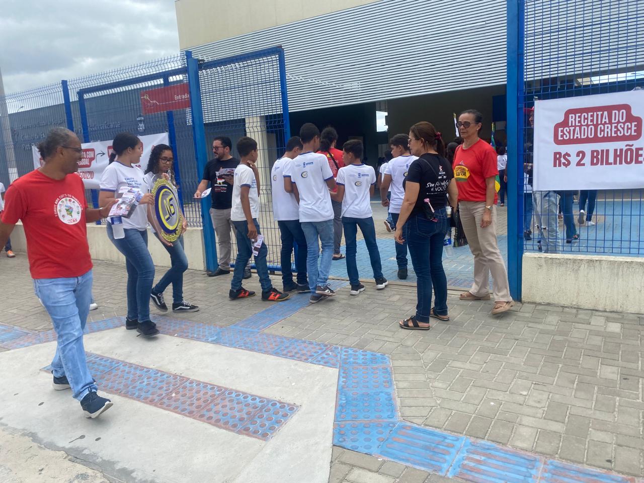 Durante a ação em Simão Dias, a direção da subsede do SINTESE na região Centro Sul, acompanhada de professoras e professores da Rede Estadual, fez panfletagem na porta da unidade escolar e buscou dialogar com estudantes, mães, pais e funcionários sobre a luta do magistério.