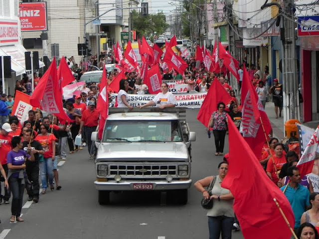 ao aderir à paralisação nacional convocada pela Confederação Nacional dos Trabalhadores em Educação – CNTE nesta terça-feira, 16 de agosto. Os professores paralisaram as aulas tendo quatro pautas para reivindicação: Repúdio ao Índice Guia de avaliação de desempenho; pela implantação da Gestão Democrática; contra criminalização das greves e cumprimento da lei do piso pelos gestores.