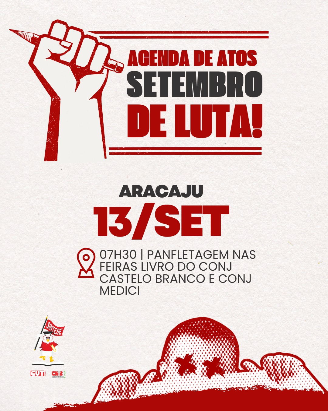 Como parte da nossa agenda de luta para o mês de setembro, seguimos mobilizados e vamos ocupar as feiras livres, em todas as regiões do estado, para dialogar diretamente com a população sobre os motivos pelos quais professoras e professores da rede estadual de ensino de Sergipe precisam continuar o processo de resistência, diante do fechamento do canal de negociação por parte do governo de Fábio Mitidieri.
