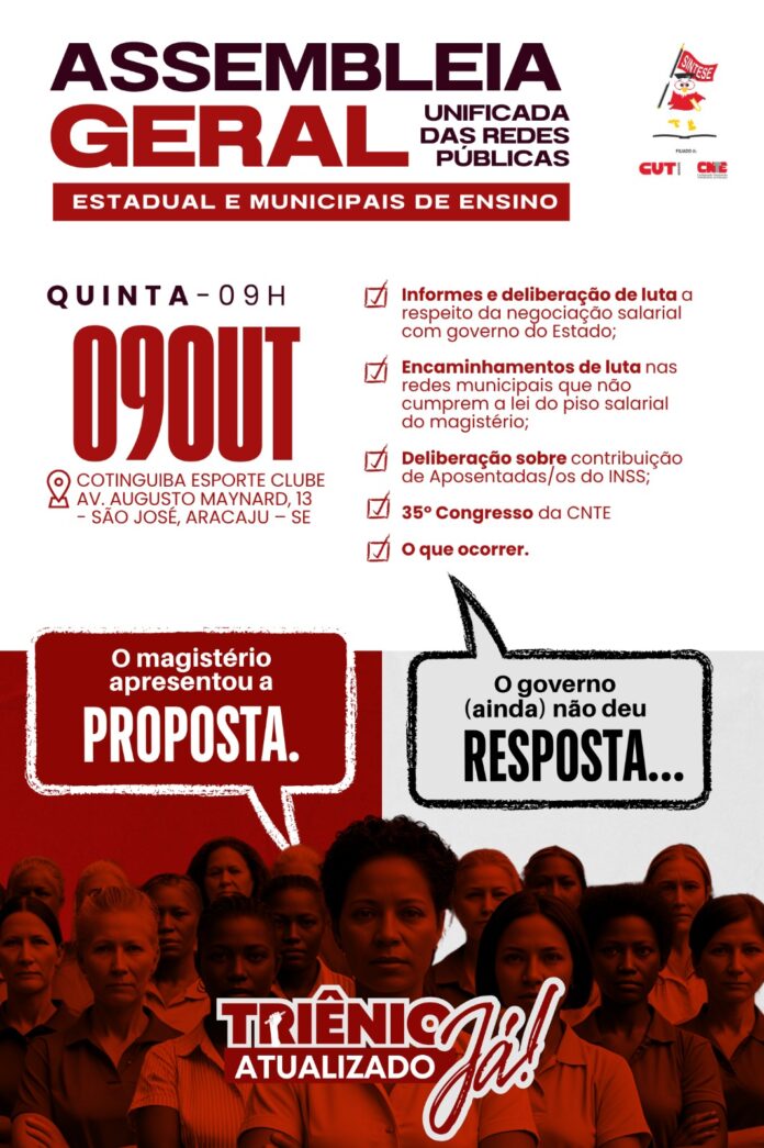 No próximo dia 9 de outubro, o SINTESE reúne professoras e professores das redes estadual e municipais de ensino para uma assembleia geral unificada extraordinária, que vai acontecer às 9 horas, no Cotinguiba Esporte Clube, em Aracaju.