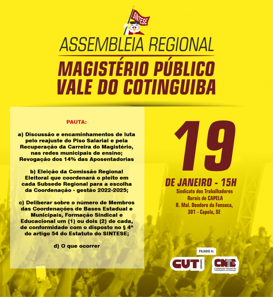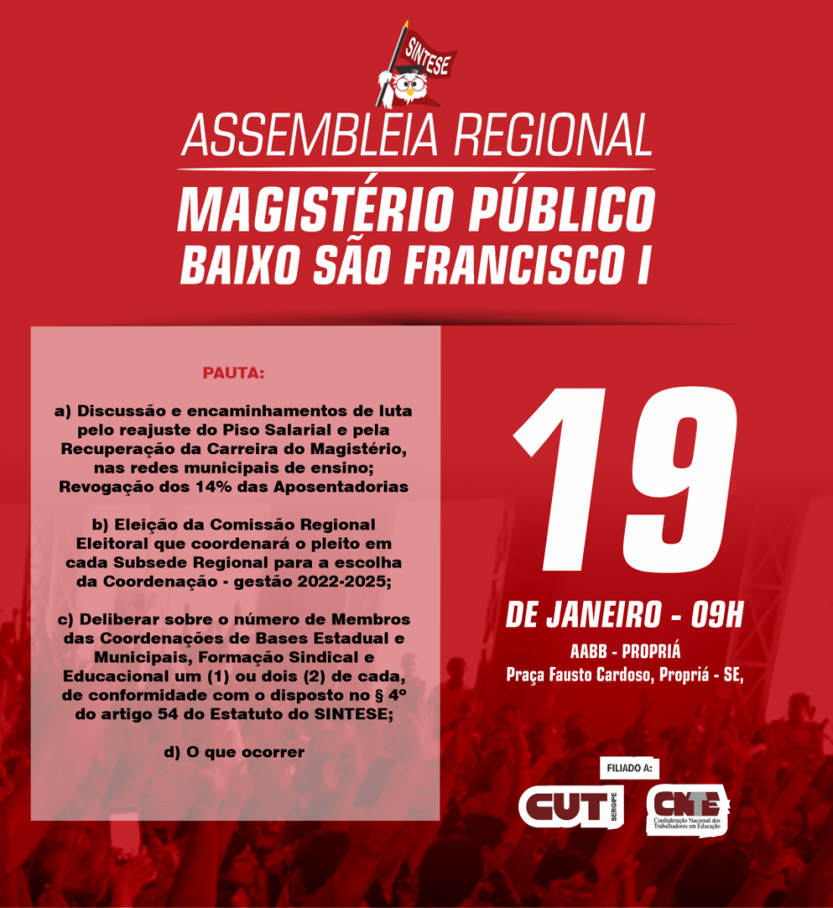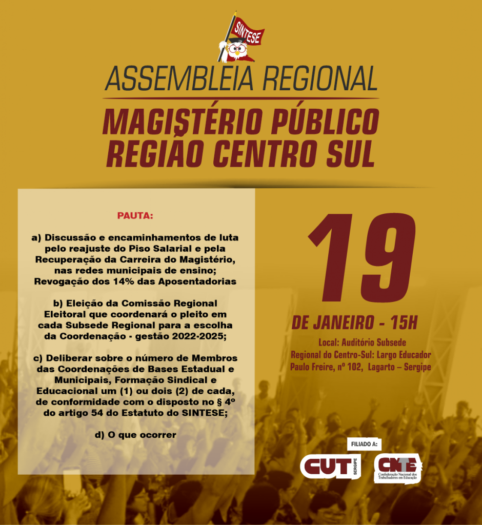 Na assembleia que se realiza dia 18 também acontecerá a eleição da Comissão Eleitoral Estadual que coordena a eleição para diretoria executiva, conselho fiscal e coordenação das subsedes regionais do Agreste, Alto Sertão, Baixo São Francisco I, Baixo São Francisco II, Centro Sul, Sul e Vale do Cotinguiba que acontecem entre os dias 21 e 25 de março. A nova gestão comandará os rumos da luta do magistério no triênio 2022/2025.