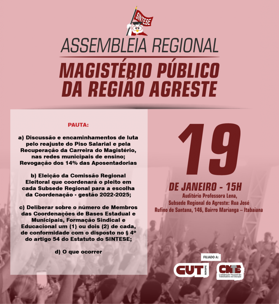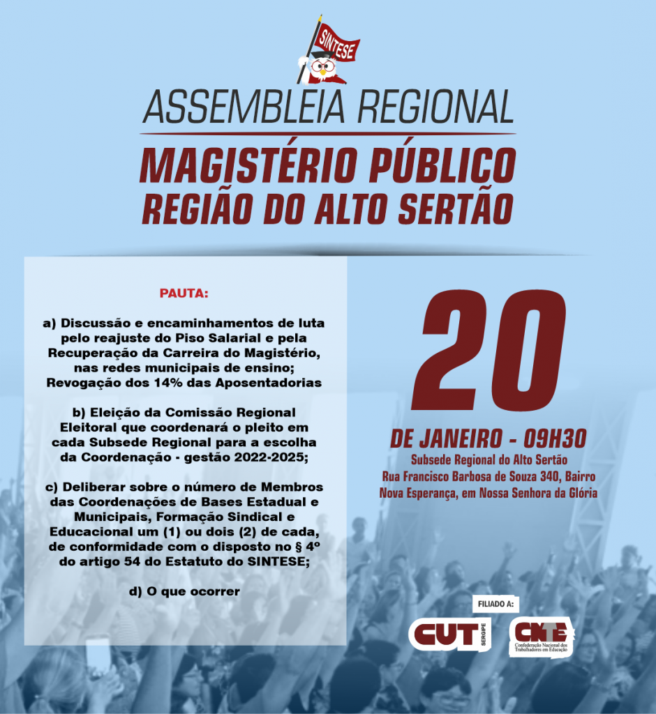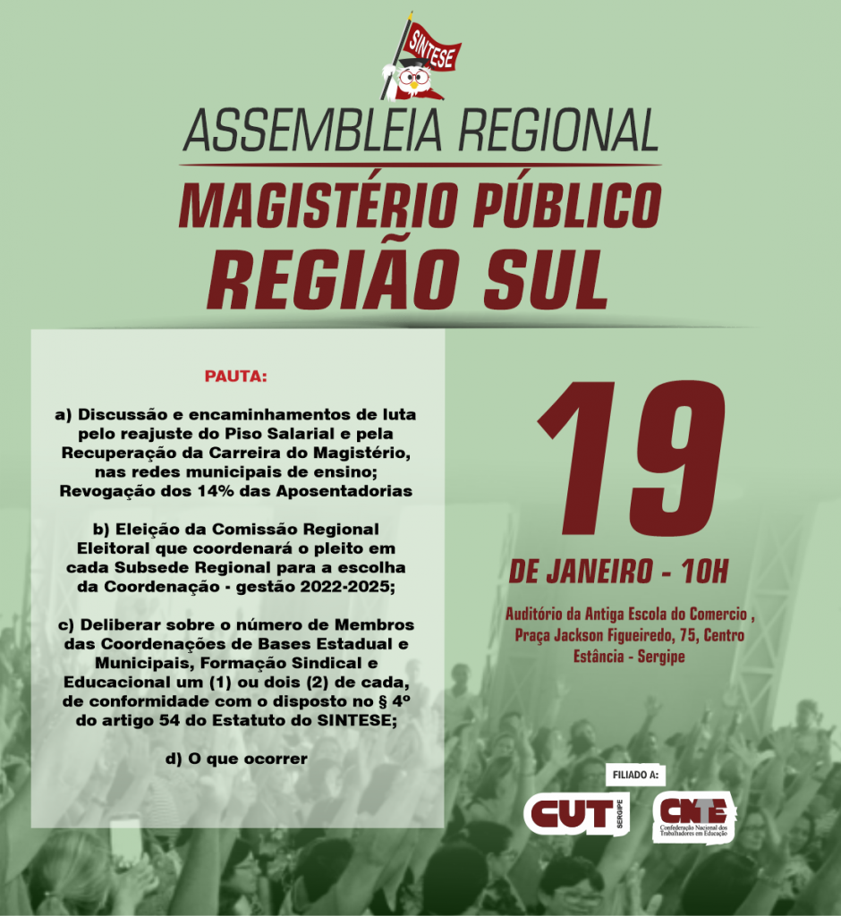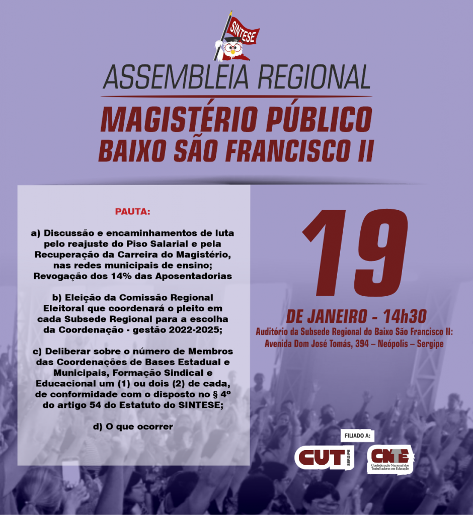 Na assembleia que se realiza dia 18 também acontecerá a eleição da Comissão Eleitoral Estadual que coordena a eleição para diretoria executiva, conselho fiscal e coordenação das subsedes regionais do Agreste, Alto Sertão, Baixo São Francisco I, Baixo São Francisco II, Centro Sul, Sul e Vale do Cotinguiba que acontecem entre os dias 21 e 25 de março. A nova gestão comandará os rumos da luta do magistério no triênio 2022/2025.