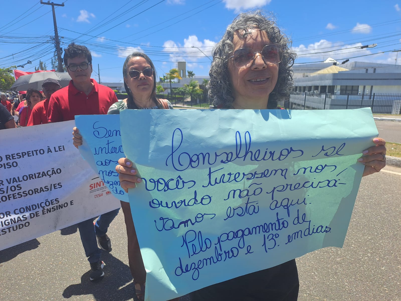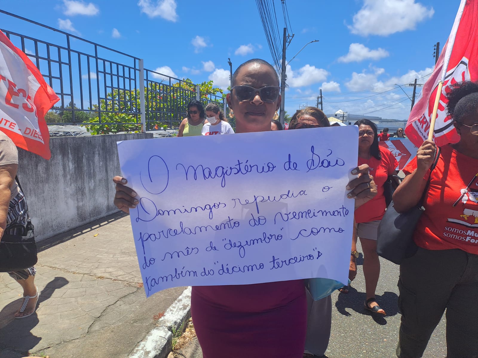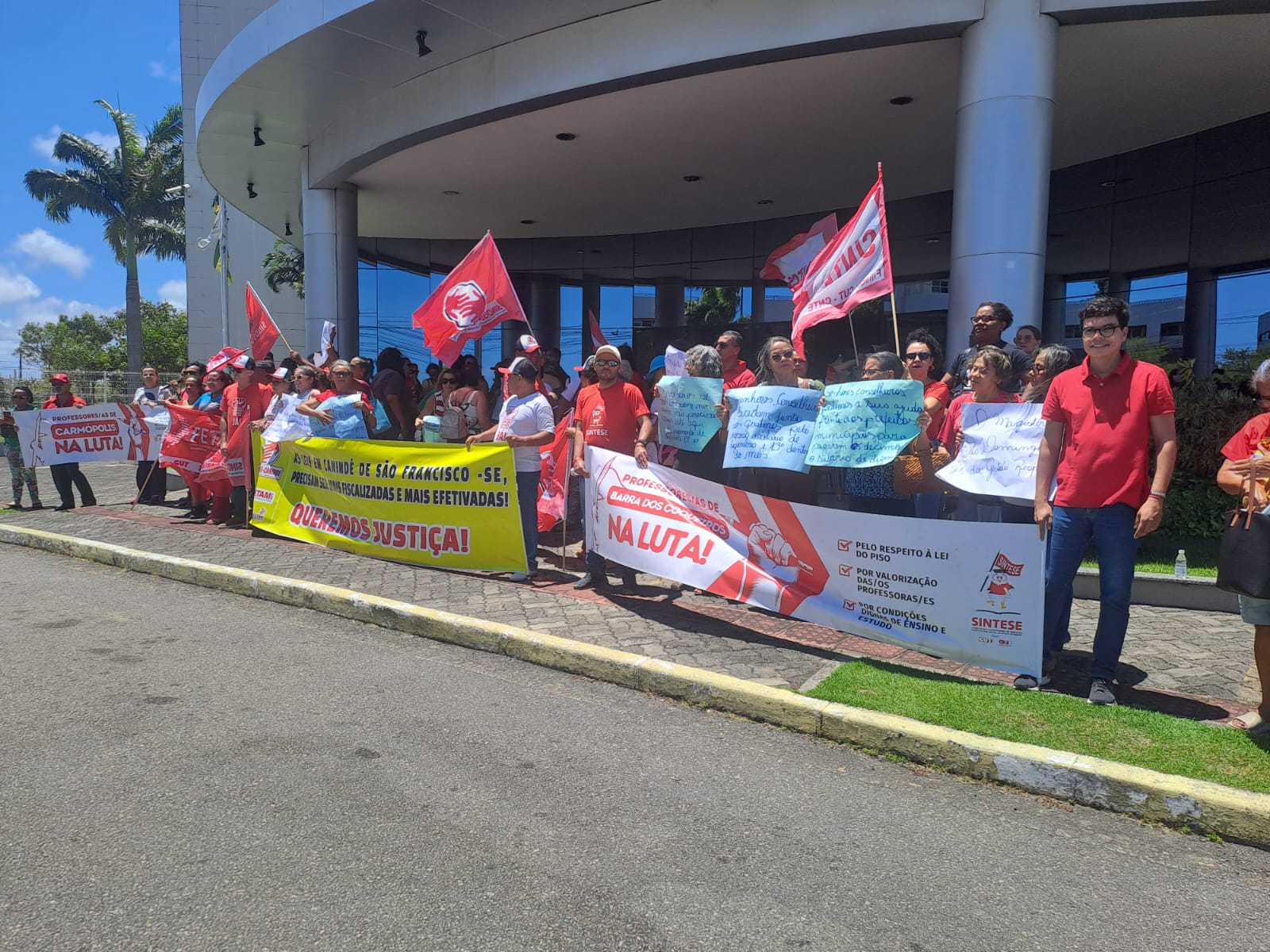 Diante de tal ameaça e do atraso dos salários de novembro, professoras e professores de 12 município sergipanos paralisaram suas atividades nesta quinta-feira e fizeram ato em frente ao TCE, com passeata até o MPE. Este foi um ato unificado entre SINTESE, CUT e Federação do Servidores Públicos Municipais do Estado de Sergipe (FETAM), já que o atraso e o não pagamento de salários não afeta apenas professoras e professores, afeta também todos outros servidores públicos municipais.