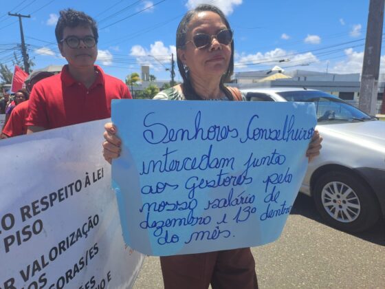 “A gente queria um dezembro diferente, mas, infelizmente, os gestores públicos escolhem a classe dos trabalhadores, aqueles que servem a população sergipana, passar o Natal com suas famílias de panelas vazias. Fica aqui o nosso repúdio a estes gestores, mas acreditando na força da nossa luta, dos professores e servidores, todo mundo unificado, que a gente vai reverter essa situação. Esperamos que cada prefeito assuma seu compromisso e pague salário, férias e 13º”, coloca a vice-presidenta do SINTESE.