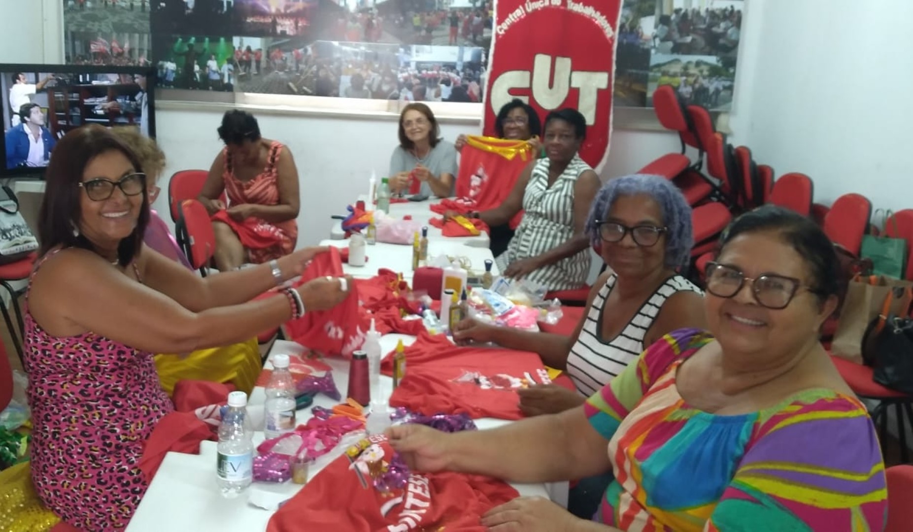 As nossas aposentadas estão a todo vapor no Centro Cultural Professor José dos Santos customizando camisetas do SINTESE para professoras e professores usarem no bloco. Esta é a segunda oficina de customização que acontece no Centro Cultural, voltada para as aposentadas.