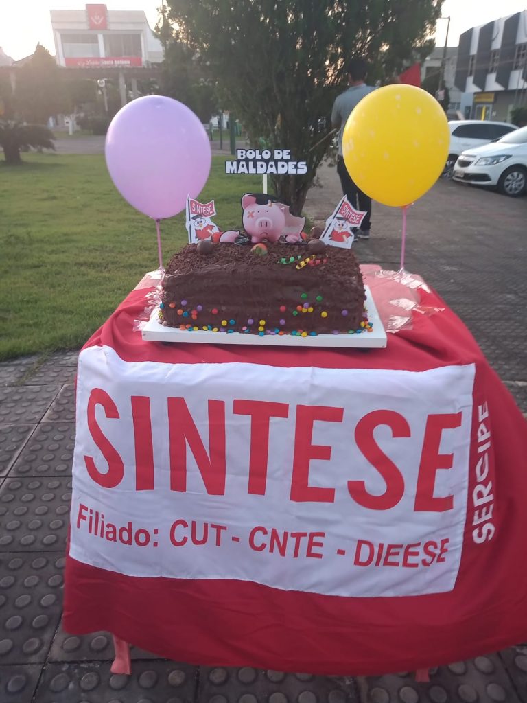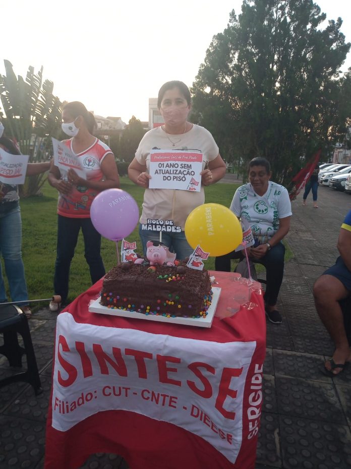 Lá também foi distribuído entre os presentes e a população, que manifestou solidariedade a luta dos professores e professoras, o “bolo de maldades”.  Simbolicamente, o bolo tem representado nos atos da região Agreste o “presente” que as prefeituras dedicam aos professores e professoras no seu dia: a negação de direitos.