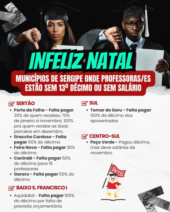 Em Graccho Cardoso, o prefeito Arakém, deve 50% do 13º salário. Em Canindé de São Francisco 15 professoras e professores também não receberam a metade (50%) de seus 13º salários, a prefeitura tem à frente Weldo Mariano.