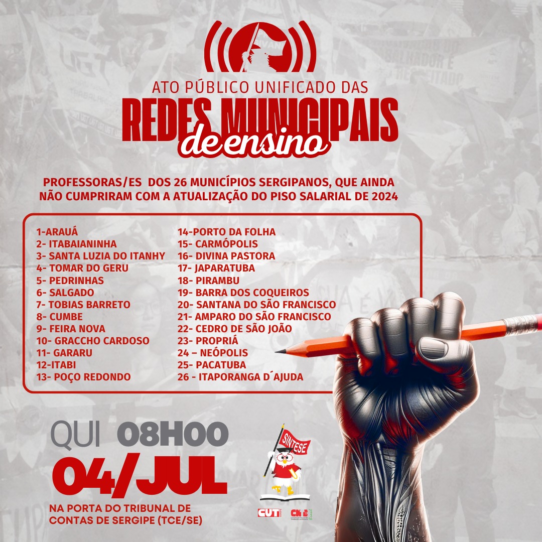 A categoria marcou nova ato nesta quinta-feira, dia 4, para acompanhar a votação dos conselheiros do Tribunal de Contas de Sergipe (TCE/SE), no pleno. A expectativa é que a Casa de Contas vote favorável as medidas cautelares, protocoladas pelo SINTESE, para que prefeitos e prefeitas, de 26 municípios sergipanos, cumpram com a Lei e realizem o pagamento do valor nominal do piso salarial 2024, junto a professoras e professores de suas redes municipais de ensino. o ato começa às 8h.