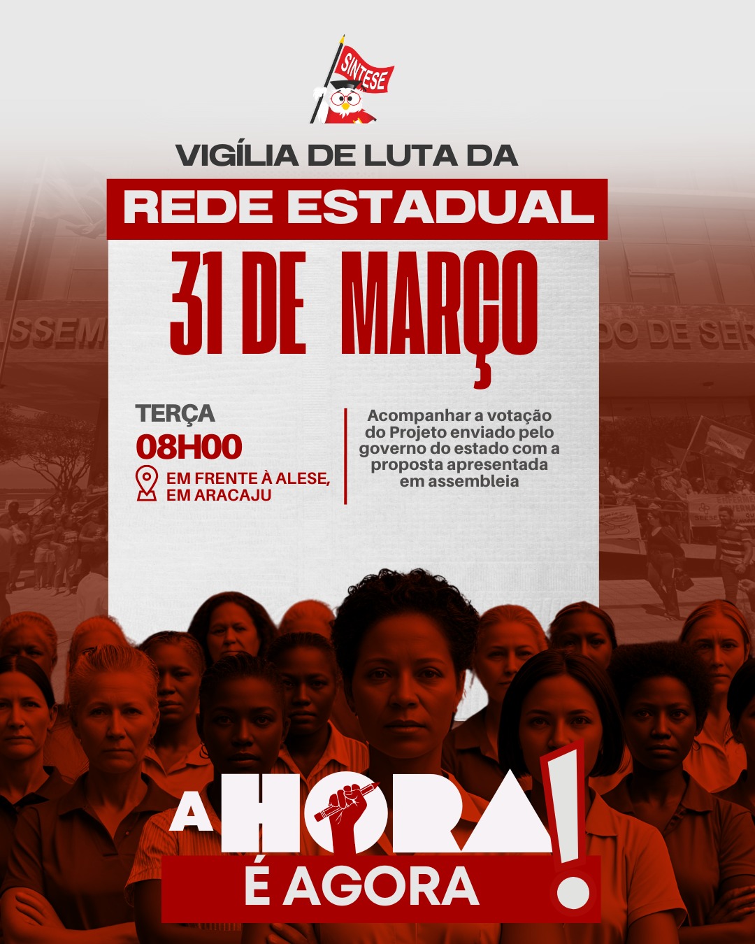 Amanhã, dia 31 de março, professoras e professores da rede estadual de ensino estarão em vigília, a partir das 8 horas, na porta da Assembleia Legislativa de Sergipe (Alese) para acompanhar a votação do projeto de lei (PL) sobre a negociação entre Governo do Estado e magistério.