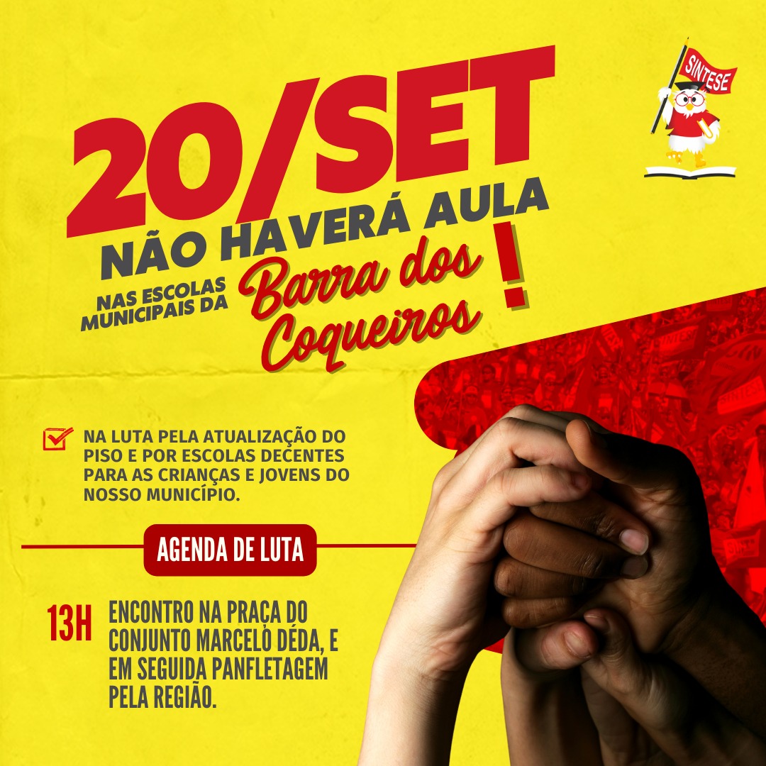 Nesta quarta-feira, dia 20, professoras e professores da rede municipal de Barra dos Coqueiros vão novamente paralisar suas atividades e fazer panfletagem, às 13h, pelas ruas do Conjunto Marcelo Déda, para denunciar a situação precária da educação. A concentração será na praça, do Conjunto.